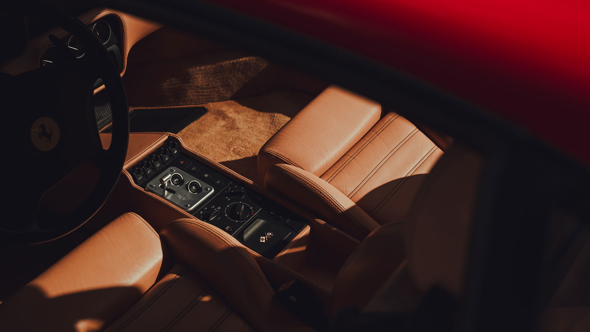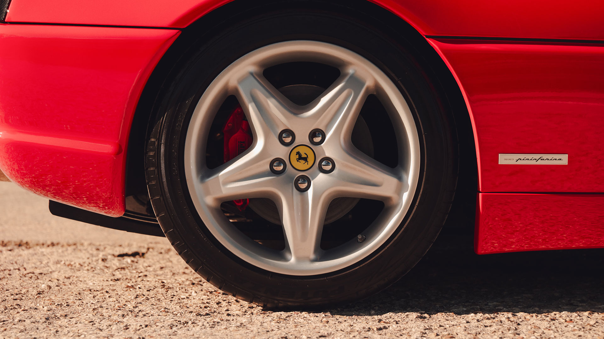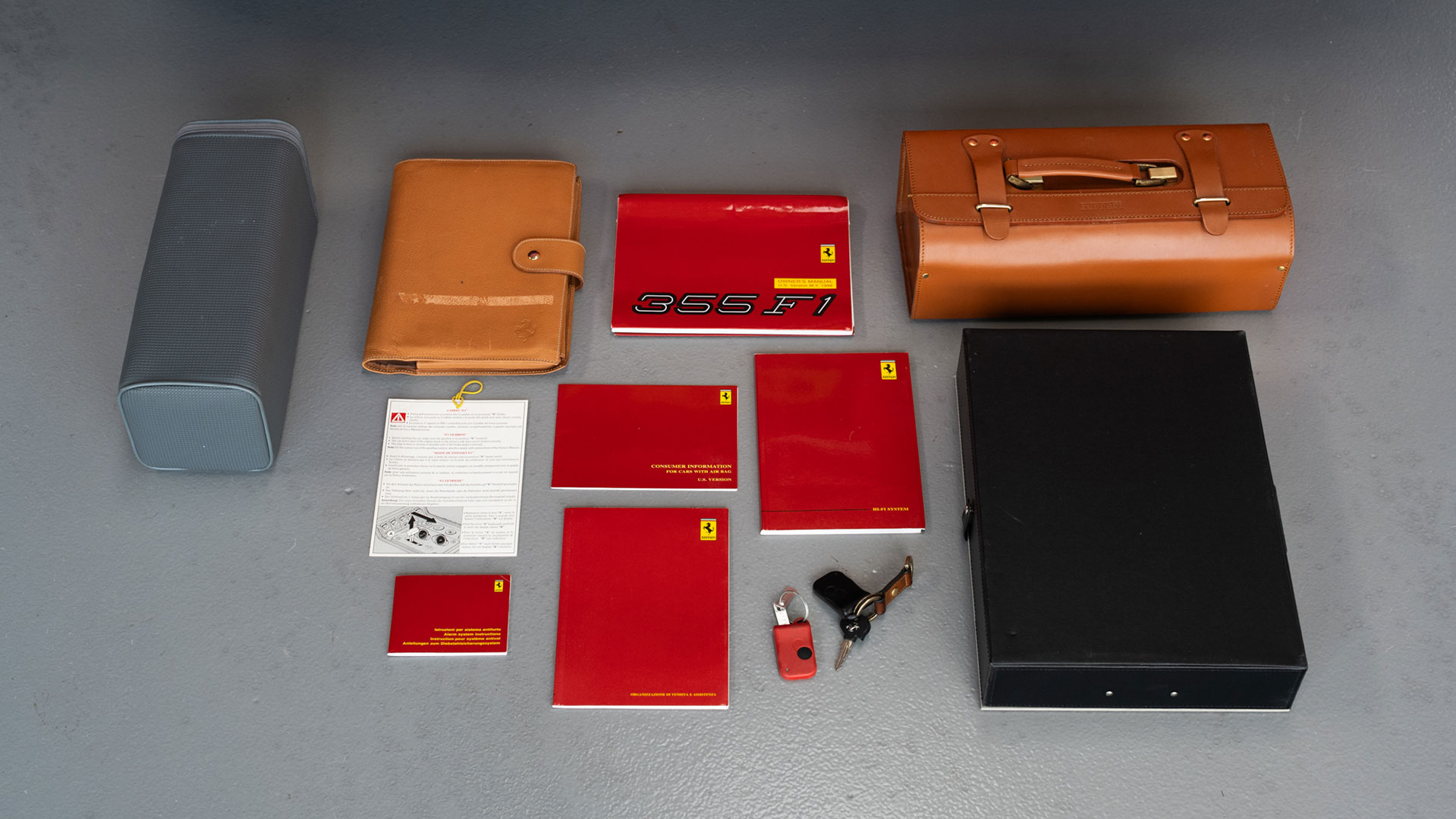 LHD Ferrari 355 F1 Berlinetta presented in Rosso Corsa with tan leather. #112658 was first delivered to Cauley Ferrari by Ferrari North America in 1998 and has been in the UK since 2016. This car comes with the F1 semi-automatic gearbox, Challenge rear grille and red brake callipers. Recent works by independent UK Ferrari specialist include recommission service and new cambelts in 2016 and Annual Service and new cambelts in 2022. Current mileage is showing 35,950 miles and the current MOT expires in April 2026. Comes with the original toolkit, Agip tyre inflator, Schedoni leather wallet, factory book pack, key and red fob, a large history file to include many original service invoices and the Certificate of Title. Presented in lovely condition.